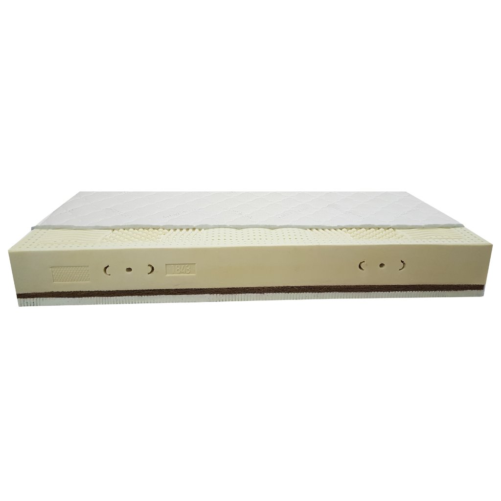 18-ti centimetrová latexová pěna ( 100% přírodní latex o objemové hmotnosti 75 kg/m3 ) profilovaná do 7-mi anatomických zón, s tuhosti H4 - měkčí strana