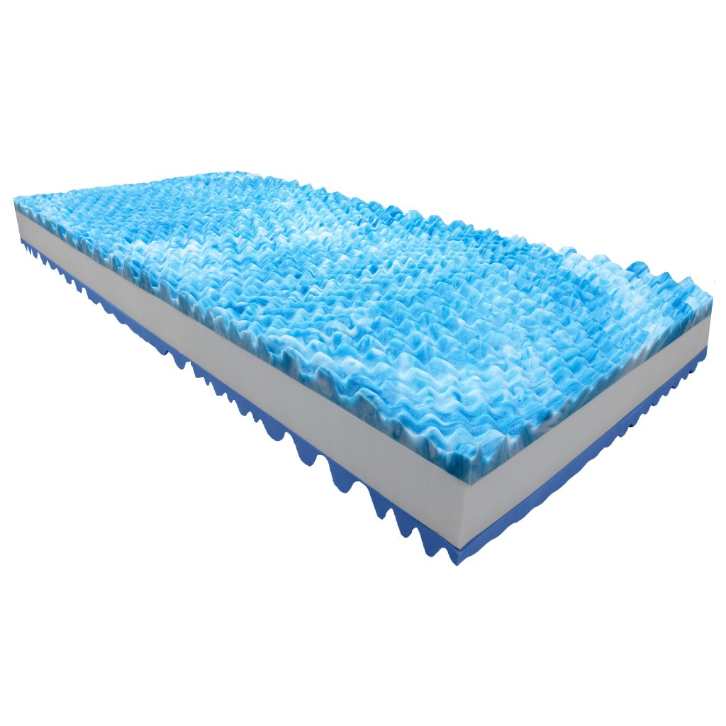 Horní část matrace: masážní nop 4/2 cm. ze světlé modré žíhané HR pěny o hustotě 35kg/m3 profilované do 7-mi anatomických zón - tuhost H2 - měkčí strana.